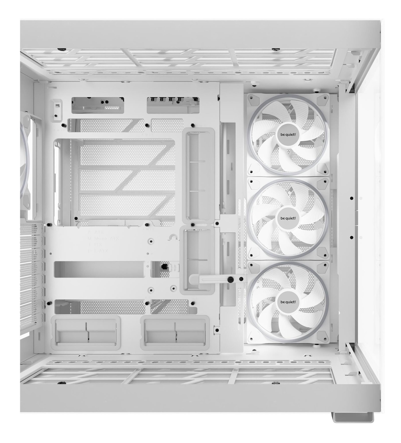 Корпус Light Base 900 FX White поставляется с четырьмя предустановленными вентиляторами Light Wings. Один вентилятор установлен в качестве заднего вытяжного, а три 140-мм PWM-вентилятора Light Wings белого цвета с перевернутыми лопастями установлены сбоку. Перевернутые лопасти гарантируют, что ваша система будет выглядеть привлекательно даже при установке в качестве бокового впускного вентилятора. Семь оптимизированных по воздушному потоку лопастей не только снижают шумовые турбулентности, но и обеспечивают необходимую производительность даже в требовательных конфигурациях.