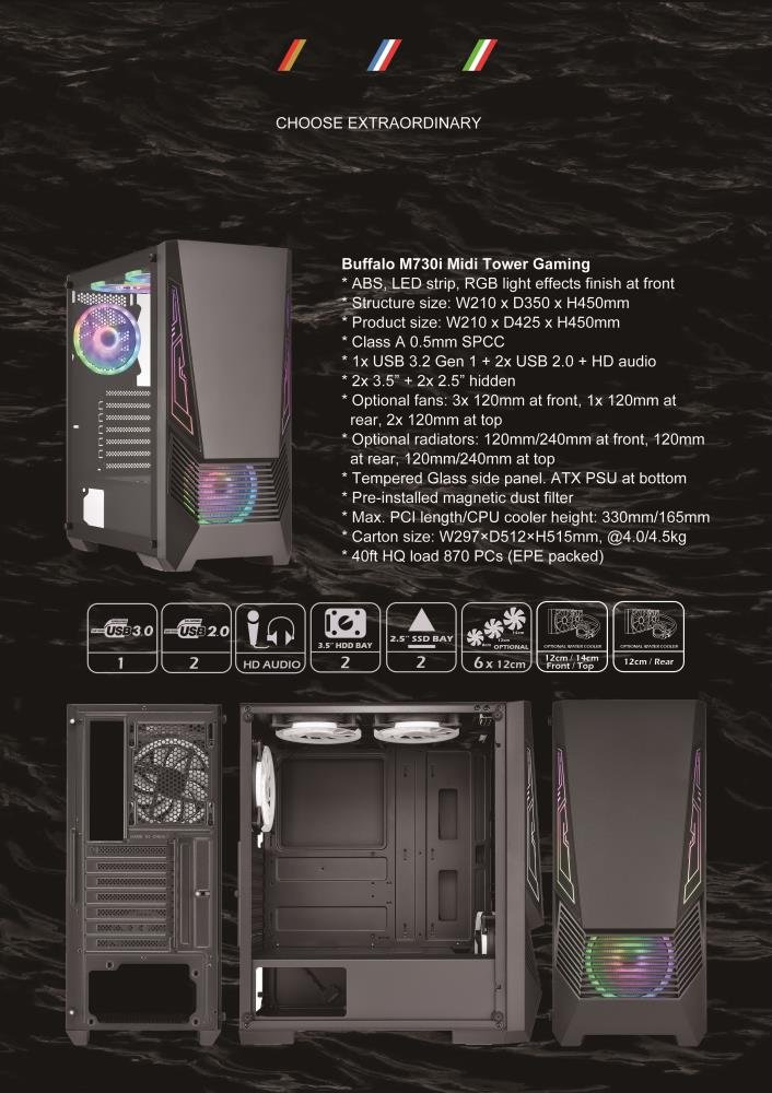 Корпус Buffalo M730i midi tower ATX предоставляет энтузиастам ПК гибкие возможности установки и бесперебойную работу. Благодаря светодиодной ленте из ABS-пластика, RGB-подсветке передней панели и боковым панелям из TG-панели, пользователи могут не только наблюдать за работой системы во время выполнения программ, но и поддерживать её охлаждение, обеспечивая превосходный воздушный поток и визуальное оформление. Этот новый корпус изготовлен из материала толщиной 0,5 мм, что обеспечивает прочную конструкцию для лучшей защиты вашей высокопроизводительной компьютерной системы.